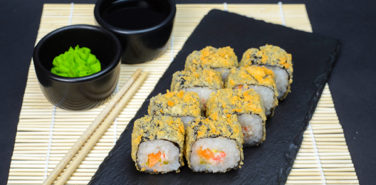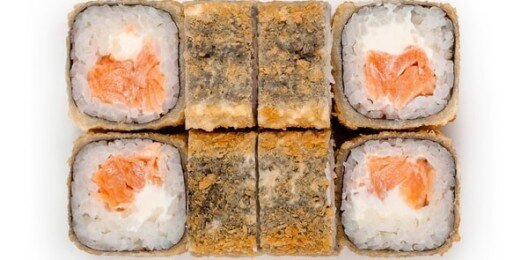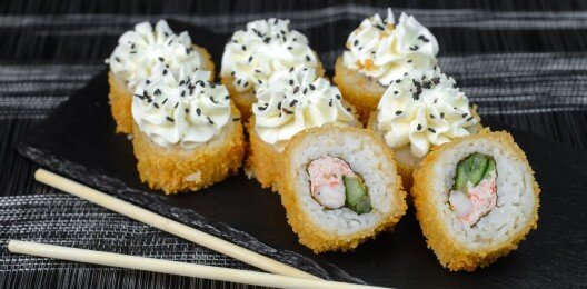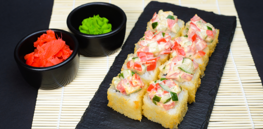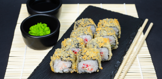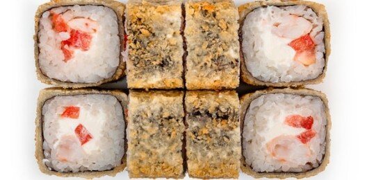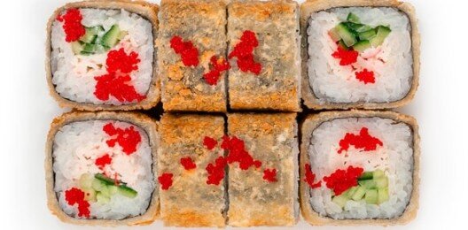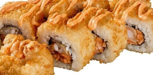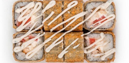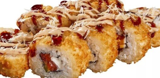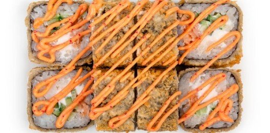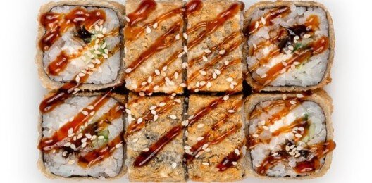 угорь, лосось, сыр сливочный, огурец, кляр, соус унаги, рис, нори. Отдельно приобретаются имбирь, васаби, соевый соус