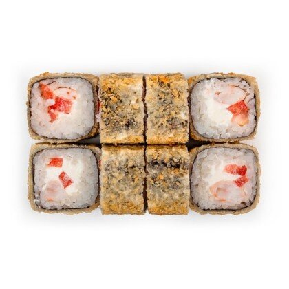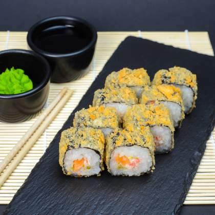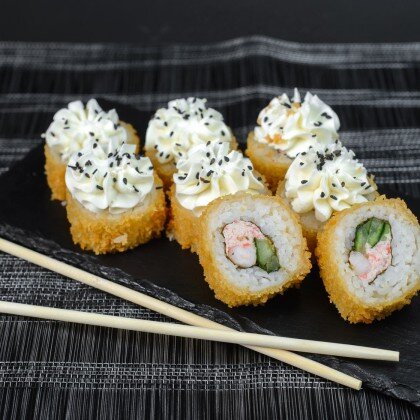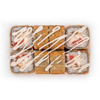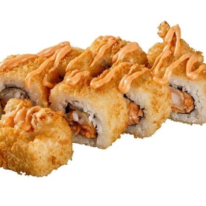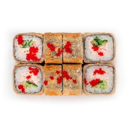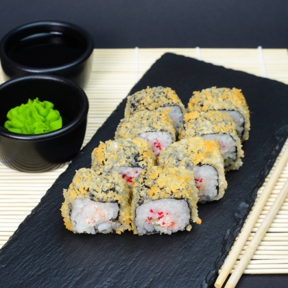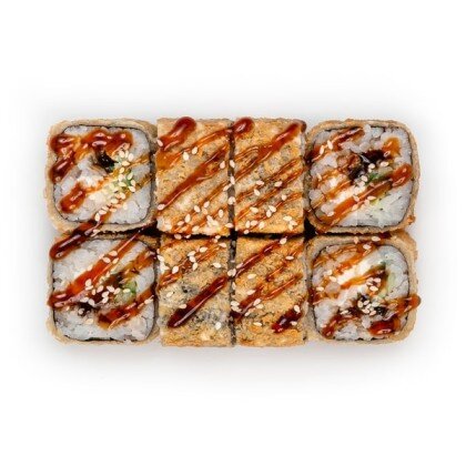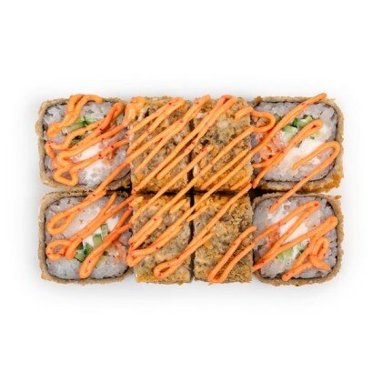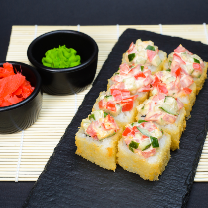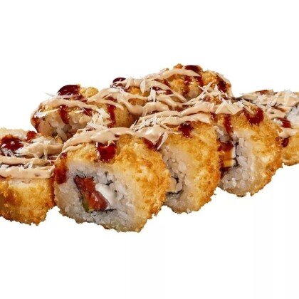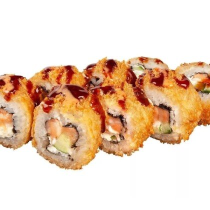 нори, рис, сыр творожный, лосось, огурец, кляр, сухари В состав ролла не входят имбирь, васаби, соевый соус