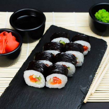 Крем-краб, филе грудки цыпленка копч., рис, свежий огурец, лист салата, зеленый лук, водоросли нори. В комплект не входят имбирь, васаби, соевый соус.