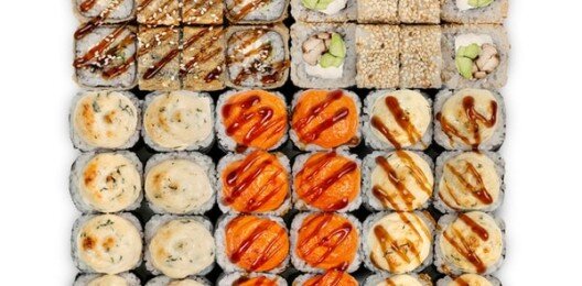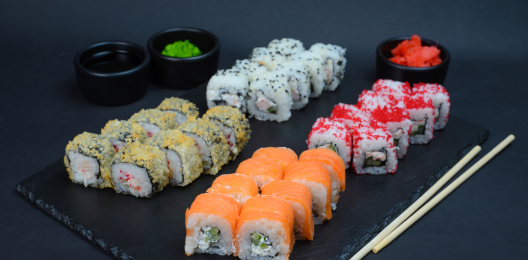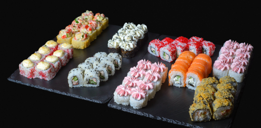 Филадельфия с огурцом, Калифорния с крабом, Футомаки сяке, Каппа маки (ролл с огурцом). В набор включено: Палочки 2шт, Соевый соус 1шт, Имбирь 1шт, Васаби 1шт.