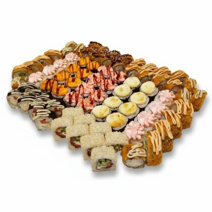 (7 роллов/56 штук). В набор включено: Палочки 2шт, Соевый соус 1шт, Имбирь 1шт, Васаби 1шт.