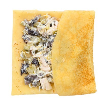 Целое блюдо в блине! Филе куриной грудки запеченное, грибы, лук, сыр моцарелла, сливочный соус.