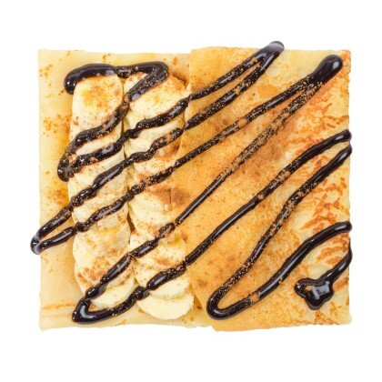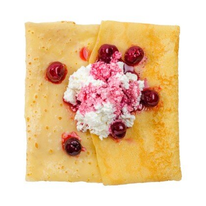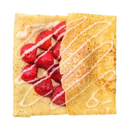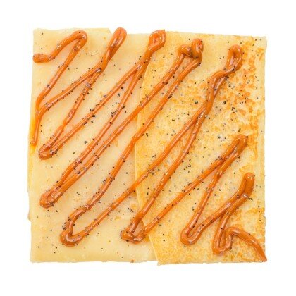Блинчик, политый сгущенным молоком. Блин (молоко, сахар, соль, яйцо куриное, сода, масло подсолнечное)